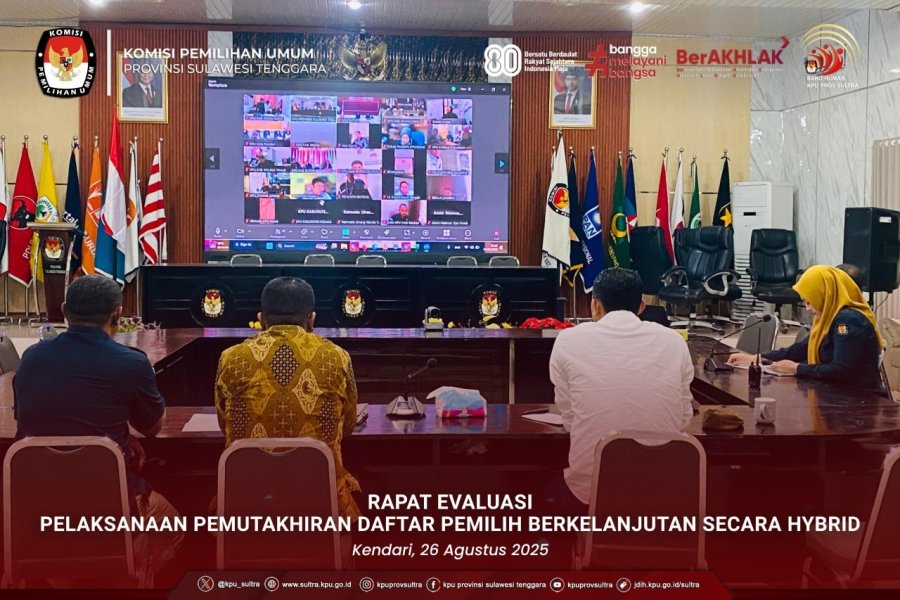 Kendari.sultra.go.id- bertempat di Aula Husni Kamil Manik Komisi Pemilihan Umum Provinsi Sulawesi Tenggara melaksanakan Rapat Evaluasi Pelaksanaan Pemutakhiran Daftar Pemilih Berkelanjutan secara hybrid bersama 17 Satker KPU Kabupaten/Kota Se Sultra. Selasa (26/8/2025). Kegiatan dibuka oleh Anggota KPU Prov. Sultra, Asril dalam arahannya bahwa Pemutakhiran Data Pemilih Berkelanjutan (PDPB) adalah kegiatan untuk memperbaharui Data Pemilih berdasarkan Daftar Pemilih Tetap dari Pemilu atau Pemilihan terakhir dan telah disinkronisasikan dengan data kependudukan secara nasional. Pada rapat zoom PDPB Mu'min Fahimuddin,selaku Kadiv Perencanaan, Data dan InformasiKPU Prov. Sultra menyampaikan progres PDPB lebih khsususnya terkait tindak lanjut dan progres pencermatan data siak dengan DPT 2024. mu'min menegaskan agar KPU Kabupaten/Kota untuk lebih fokus melakukan Coklit terbatas terkait 3 item data yaitu Data meninggal, Data Ganda dan Data tidak padan aagar dilakukan secara 100 % Hadir dalam rapat zoom progresPDPB 17 Satker KPUkab/Kota yang diwakili oleh Ketua dan Anggota KPU Divisi Perencanaan data dan Informasi, Kasubbag Rendatin dan Admin/Operator Sidalih Kabupaten/Kota Se Sulawesi Tengah. ....