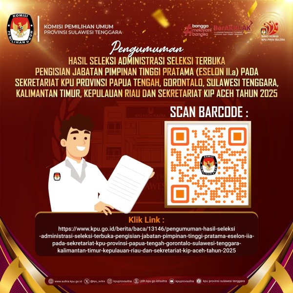 Berikut Pengumuman Hasil Seleksi Administrasi Seleksi Terbuka Pengisian Jabatan Tinggi Pratama (Eselon II.a) Pada Sekretariat KPU Provinsi Papua Tengah, Gorontalo, Sulawesi Tenggara, Kalimantan Timur, Kepulauan Riau, dan Sekretariat KIP Aceh Tahun 2025. ....