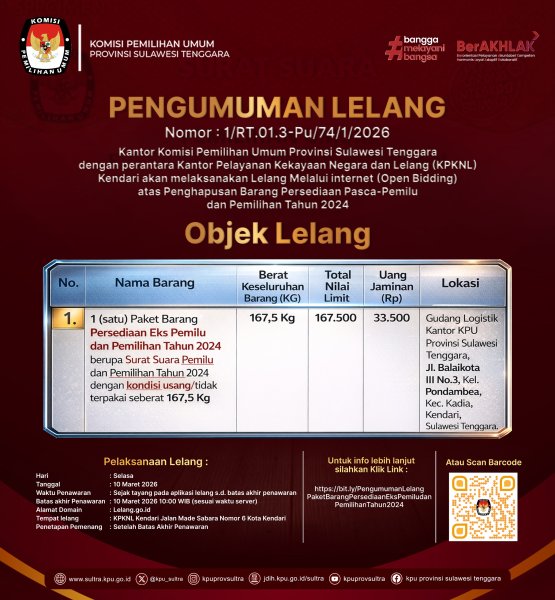 Melalui pelaksanaan lelang ini, KPU Provinsi Sulawesi Tenggara menegaskan komitmennya dalam mewujudkan tata kelola barang milik negara yang tertib, transparan, dan akuntabel sesuai dengan peraturan perundang-undangan yang berlaku.Informasi lebih lanjut dapat diakses melalui tautan resmi yang telah disediakan atau Download Disini
