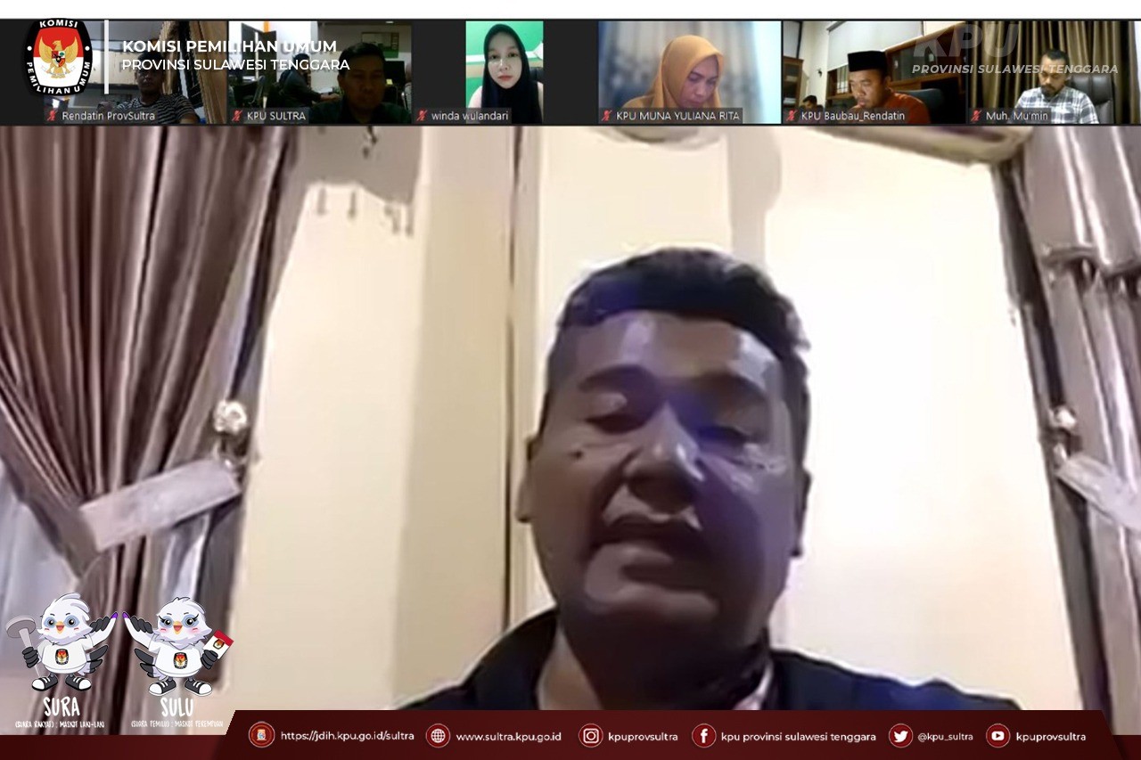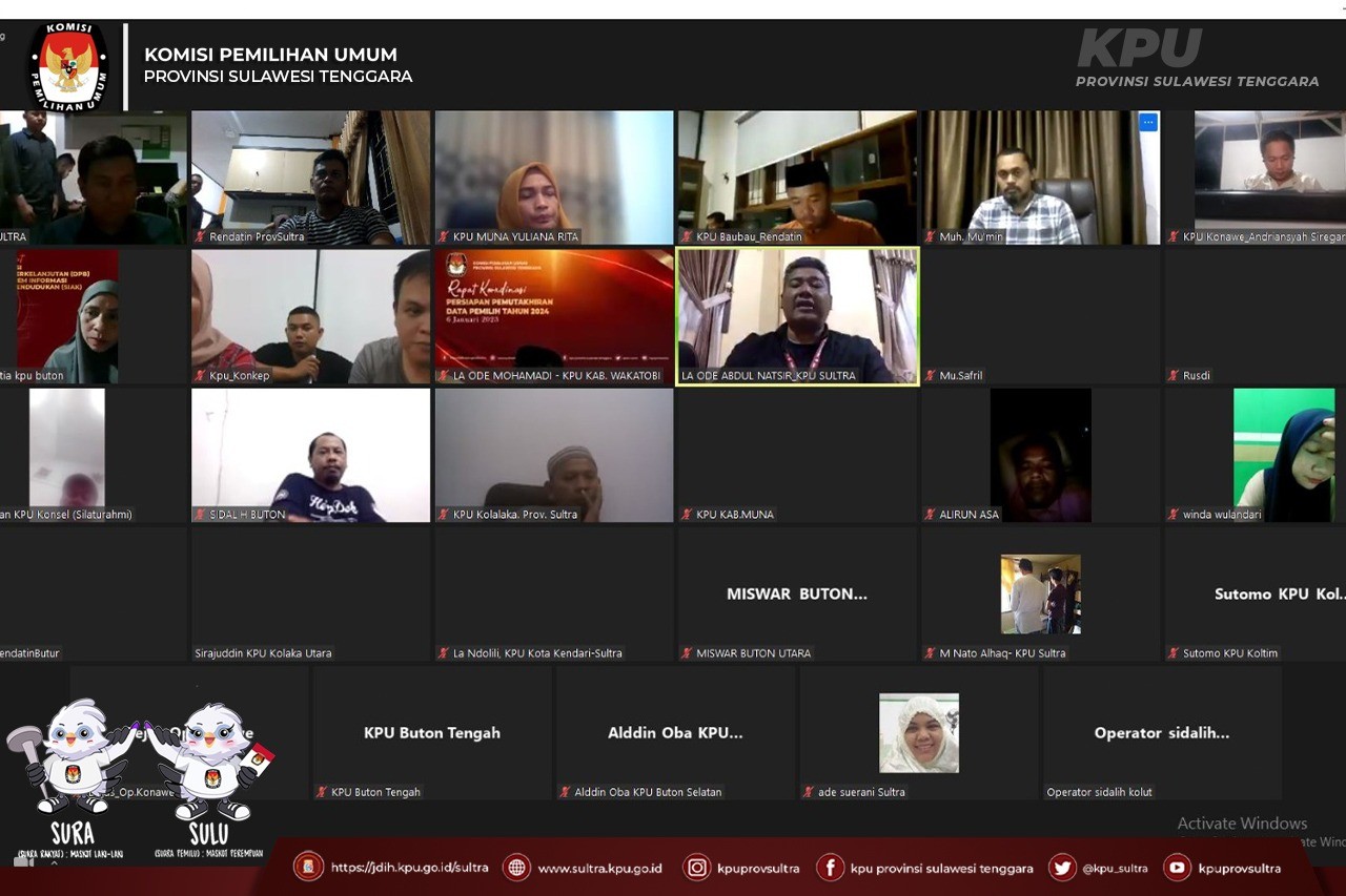 KPU Provinsi Sulawesi Tenggara menyelenggarakan kegiatan Bimbingan Teknis Penyusunan Daftar Pemilih dan Pemetaan TPS Pemilu Tahun 2024 bersama KPU Kabupaten/Kota se Sulawesi Tenggara secara daring melalui zoom meeting bersama Koordinator Divisi Perencanaan Data dan informasi Kabupaten/ Kota, Kasubag Perencanaan Data dan Informasi dan Operator Sidalih pada hari Jumat (03/02/2023).