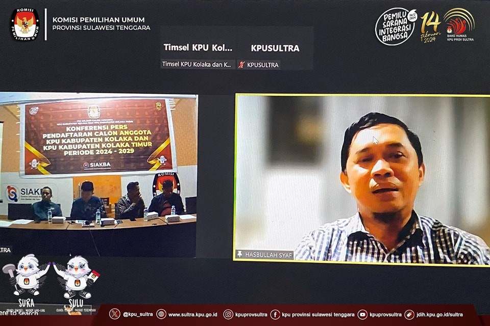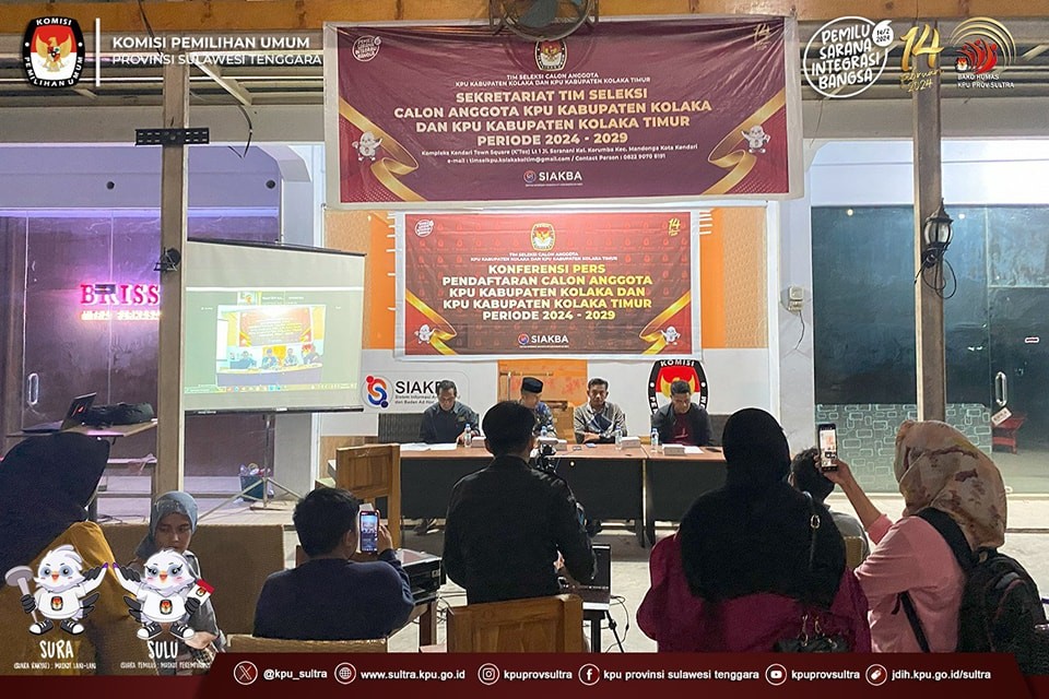 Kendari, 26 November 2023 Bertempat di Kendari Town Squere (K"Toz) Kendari telah berlangsung Konferensi Pers Pendaftaran Calon Anggota KPU Kabupaten Kolaka dan KPU Kabupaten Kolaka Timur Periode 2024-2029. Ketua tim seleksi La Ode Imran, S.Pd., M.Sos mengatakan Konferensi Pers dilaksanakan dalam rangka menyampaikan sosialisasi terkait seleksi Calon Anggota KPU Kabupaten Kolaka dan KPU Kabupaten Kolaka Timur. Sesuai dengan Juknis KPU No. 1667 tahun 2023 pendaftaran dimulai tanggal 26 Nov 2023 s/d 7 Desember 2023. Kami menyampaikan kepada masyarakat bagi yang berminat menjadi Anggota KPU Kabupaten Kolaka dan Kabupaten Kolaka Timur. Dan kami berkewajiban membuka ruang kepada wartawan terkait hal-hal berkaitan dengan seleksi KPU.