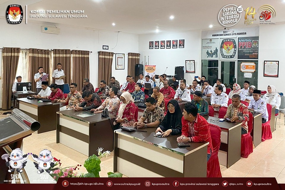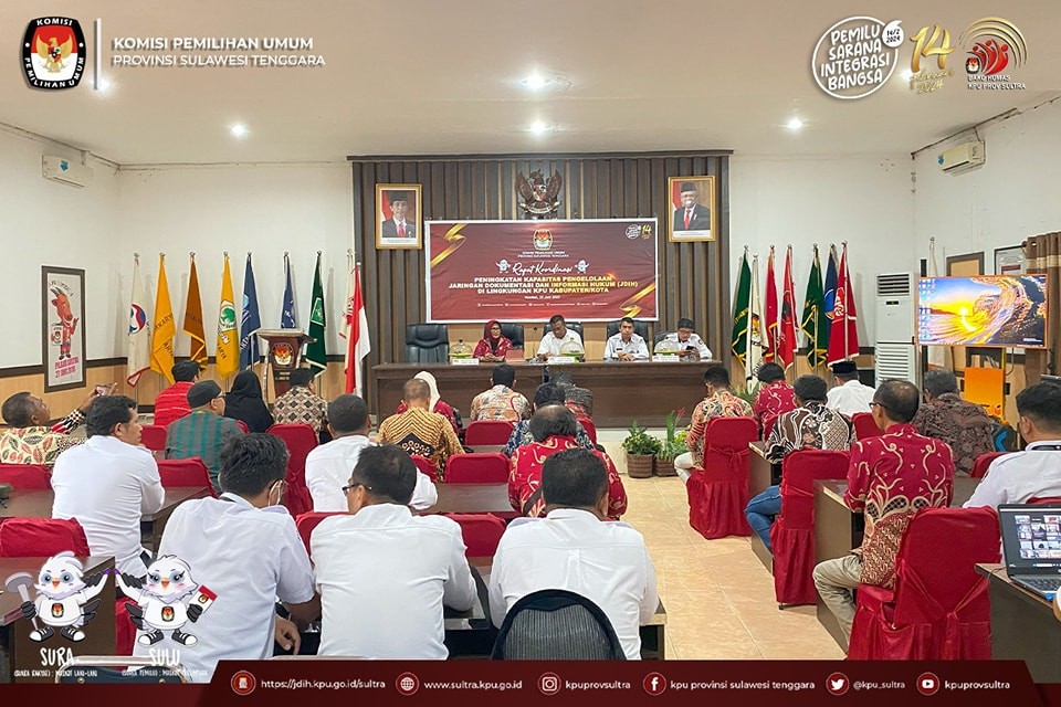 KPU Provinsi Sulawesi Tenggara menggelar Rapat Koordinasi Peningkatan Kapasitas Pengelolaan Jaringan Dokumentasi dan Informasi Hukum (JDIH) bersama 17 KPU Kabupaten/Kota se Sulawesi Tenggara