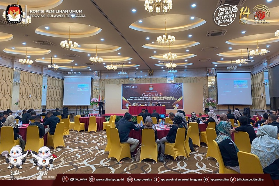 Kendari, 28 Kendari 2023 KPU Provinsi Sulawesi Tenggara melaksanakan kegiatan Rapat Kerja Teknis Pengelolaan dan Pertanggungjawaban Dana Hibah Pemilihan Serentak Tahun 2024 yang diikuti oleh Sekretaris beserta pengelola keuangan KPU Kabupaten/Kota se-Sulawesi Tenggara. Acara dibuka oleh Ketua KPU Provinsi Sulawesi Tenggara Bapak DR. Asril, S.Sos., M.Si didampingi oleh Kordiv Hukum dan Pengawasan Ibu Suprihaty Prawaty Nengtias, SP., M.P. Dalam sambutannya Ketua KPU Provinsi Sulawesi Tenggara menyampaikan kepada jajaran sekretariat untuk selalu menjaga sinergitas dengan Komisioner KPU masing-masing agar pengelolaan keuangan dapat dipertanggungjawabkan dengan baik khususnya pertanggungjawaban dana hibah pemilihan serentak tahun 2024 nanti. Ibu Suprihaty Prawaty Nengtias, SP., M.P menambahkan suksesnya tahapan juga harus diiringi dengan suksesnya pertanggungjawaban keuangan.