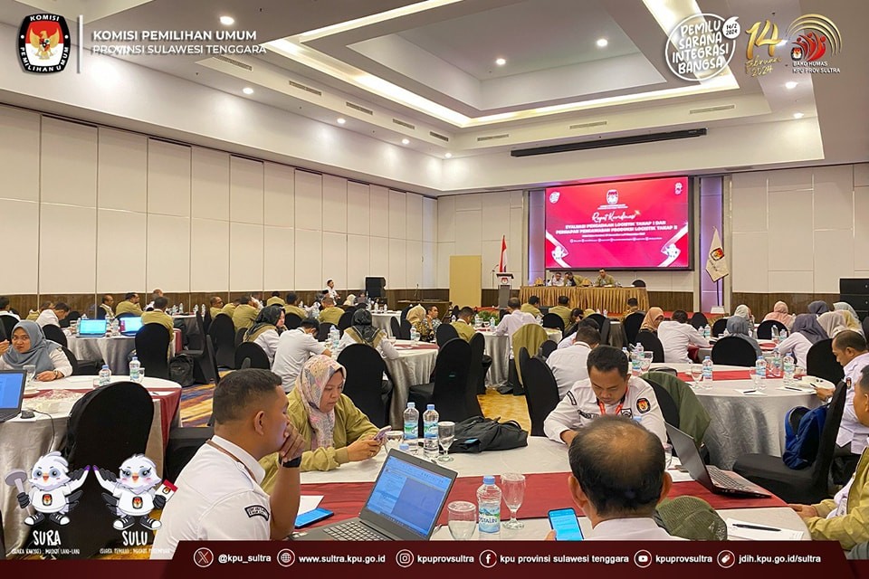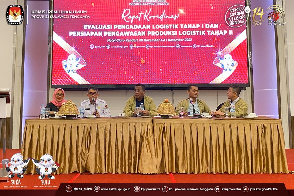 Kendari, 2 November 2023 bertempat di HOtel Claro KPU Provinsi Sulawesi Tenggara menggelar kegiatan Rapat Koordinasi Evaluasi Pengadaan Logistik Tahap I dan Persiapan Pengawasan Produksi Logistik Tahap II. Kegiatan dibuka oleh Ketua KPU Provinsi Sulawesi Tenggara Bapak Asril yang dalam sambutannya mengatakan bahwa tahapan logistik dimulai oleh KPU RI setelah menentukan penyedia pemenang tender kemudian melalui PPK memilih penyedia sesuai kebutuhan. Pengadaan logistik tahap II berbeda perlakuannya dengan pengadaan logistik tahap I. Pengadaan logistik tahap II agak menyita tenaga karena setelah tiba langsung sortir maka dibutuhkan sumber daya manusia untuk pelipatan dan sortir sehingga prinsip tepat jenis, tepat jumlah, tepat kualitas, tepat waktu, tepat sasaran dan tepat biaya terpenuhi. Atas pencetakan tahap II yang sedang berjalan maka untuk memastikan prinsip 6T maka perlu dilakukan monitoring. Untuk sumber daya manusia yang terlibat diserahkan kepada KPU Kabupaten/Kota masing-masing. Koordinator Divisi Perencanaan Data dan Informasi Bapak Muh. Mu'min Fahimuddin menambhakan bahwa Penyediaan logistik tahap II berdasarkan regulasi sesuai dengan jumlah 2% TPS. Untuk TPS yang punya loksus perlakuannya berbeda yaitu sebagai DPTB. Jadi pengepakan harus sesuai dengan perlakuan tersebut. Selain itu Koordinator Divisi Teknis Penyelenggaraan Pemilu Bapak Hazamuddin dan Koordinator Divisi Hukum dan Pengawasan Ibu Suprihaty Prawaty Nengtias mengatakan bahwa Logistik Pemilu adalah jantungnya Pemilu maka perlu persiapan bukan hanya kebutuhan tapi SDM nya juga. Jadi bukan hanya tanggungjawab divisi keuangan, umum dan logistik tapi tanggungjawab semua agar logistik berjalan dengan baik.