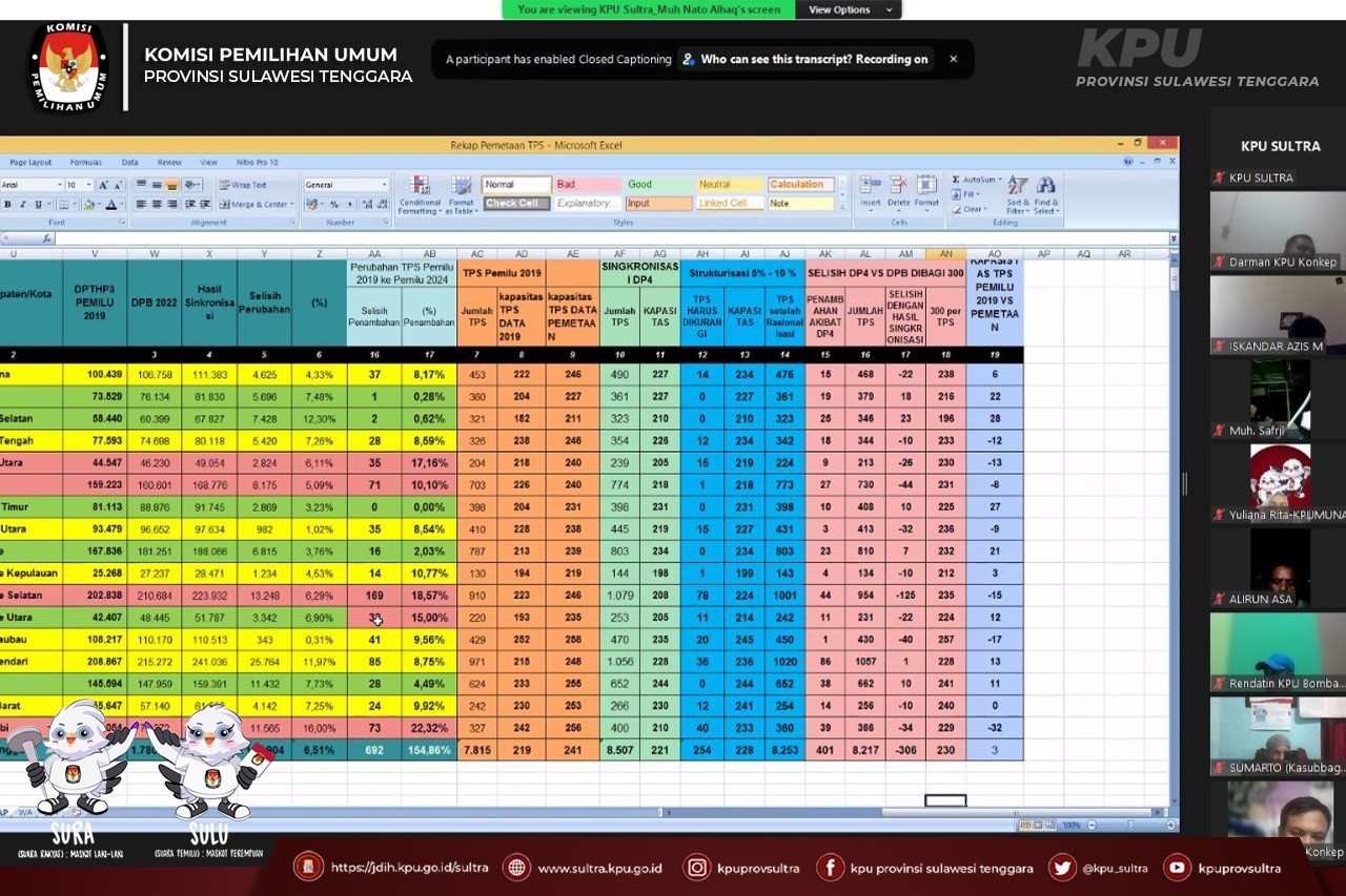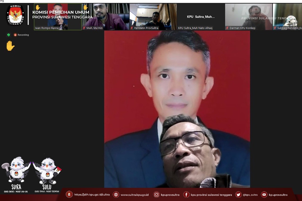 KPU Provinsi Sulawesi Tenggara melaksanakan Rapat Koordinasi Penyusunan Daftar Pemilih dan Penyusunan TPS Pemilu Tahun 2024 secara daring melalui zoom meeting bersama 17 KPU Kabupaten/Kota se Sulawesi Tenggara, Minggu (5/02/2023) yang diikuti oleh Koordinator Perencanaan Data dan Informasi, Kasubag perencanaan data dan Informasi serta admin dan Operator Sidalih.