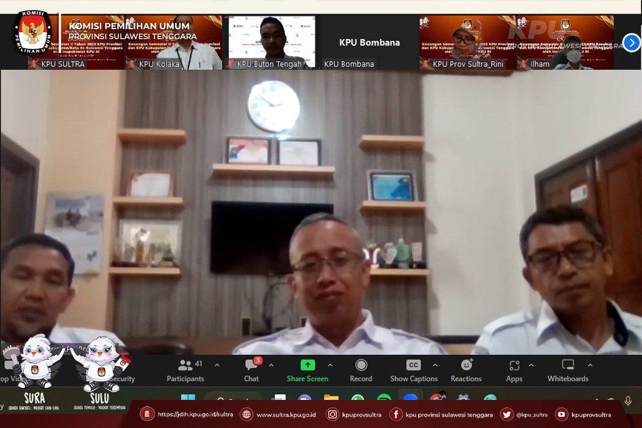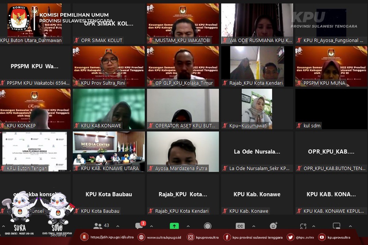 Inspektorat KPU RI melaksanakan kegiatan Review Laporan Keuangan Semester II Tahun 2022 KPU Provinsi dan KPU Kabupaten/Kota se Sulawesi Tenggara secara daring melalui zoom meeting, Senin (13/02/2023). Kegiatan ini diikuti oleh Sekretaris, Bendahara Pengeluaran, Operator Aset dan Operator GLP KPU Kabupaten/Kota Se Sulawesi Tenggara.