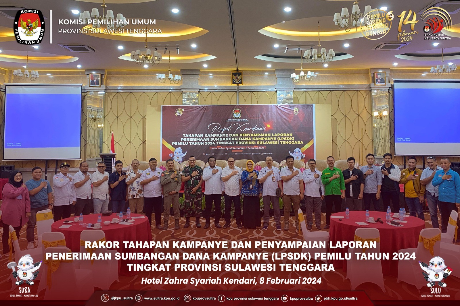 Ketua KPU Prov. Sultra Asril dalam sambutannya menyampaikan bahwa KPU Prov. Sultra menghimbau kepada seluruh peserta Pemilu Tahun 2024 untuk mentaati seluruh aturan tahapan kampanye. apabila itu dilanggar maka akan berpotensi pidana bahkan sampai dengan pembatalan sebagai Peserta Pemilu Tahun 2024 dan jika ditemukan indikasi-indikasi pelanggaran. 10 Februari 2024 seluruh iklan kampanye di media harus sudah di takedown dari proses penyiaran. Menyangkut tentang Laporan Penerimaan Sumbangan Dana Kampanye (LPSDK), menurut jadwal tahapan Pelaporan Dana Kampanye, untuk penyampaian LPSDK bagi Peserta Pemilu Tahun 2024 adalah terakhir pada tanggal 11 Februari 2024. Hal ini harus dipenuhi oleh Peserta Pemilu karena salah satu hal yang dapat mendiskualifikasi Peserta Pemilu dalam kontestan Pemilihan Umum Tahun 2024 adalah tidak melaporkan Laporan Penerimaan Sumbangan Dana Kampanye.