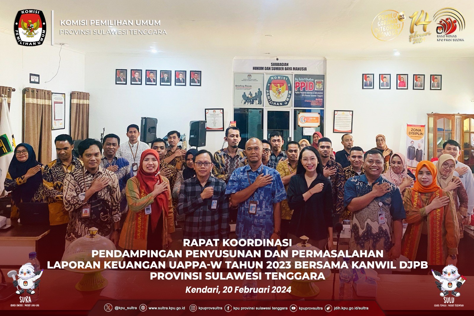 Kamis, KPU Provinsi Sulawesi Tenggara melaksanakan Rapat Koordinasi Pelaksanaan Kampanye dan Penyampaian Laporan Penerimaan Sumbangan Dana Kampanye Pemilu Tahun 2024 tingkat Provinsi Sulawesi Tenggara, bertempat di Zahra Syariah Hotel Kendari (8/2/2024).