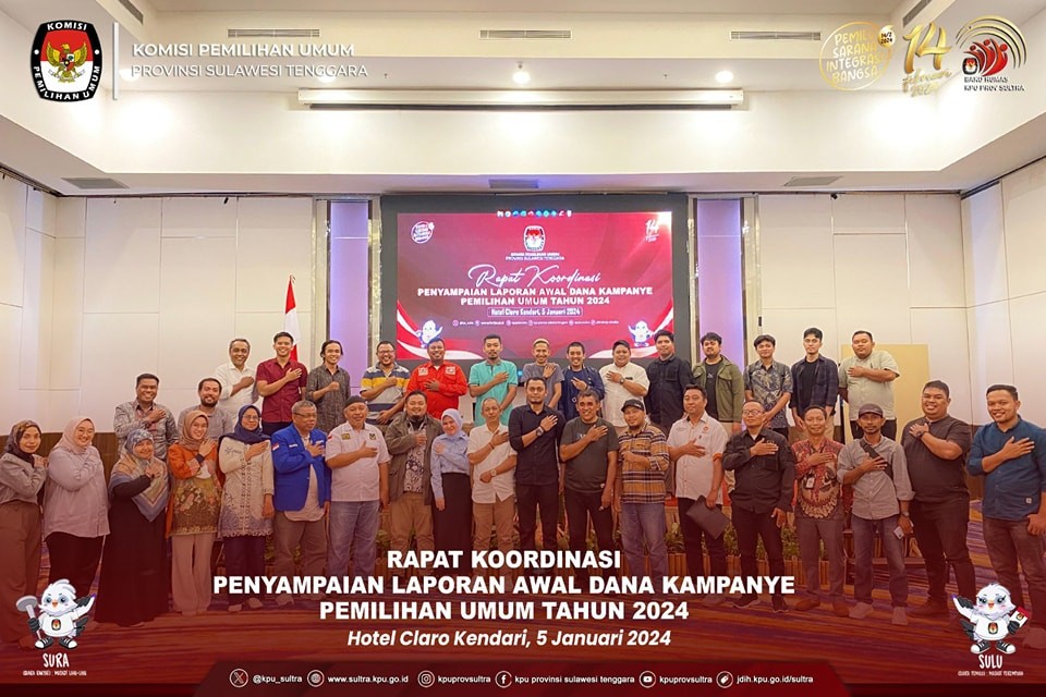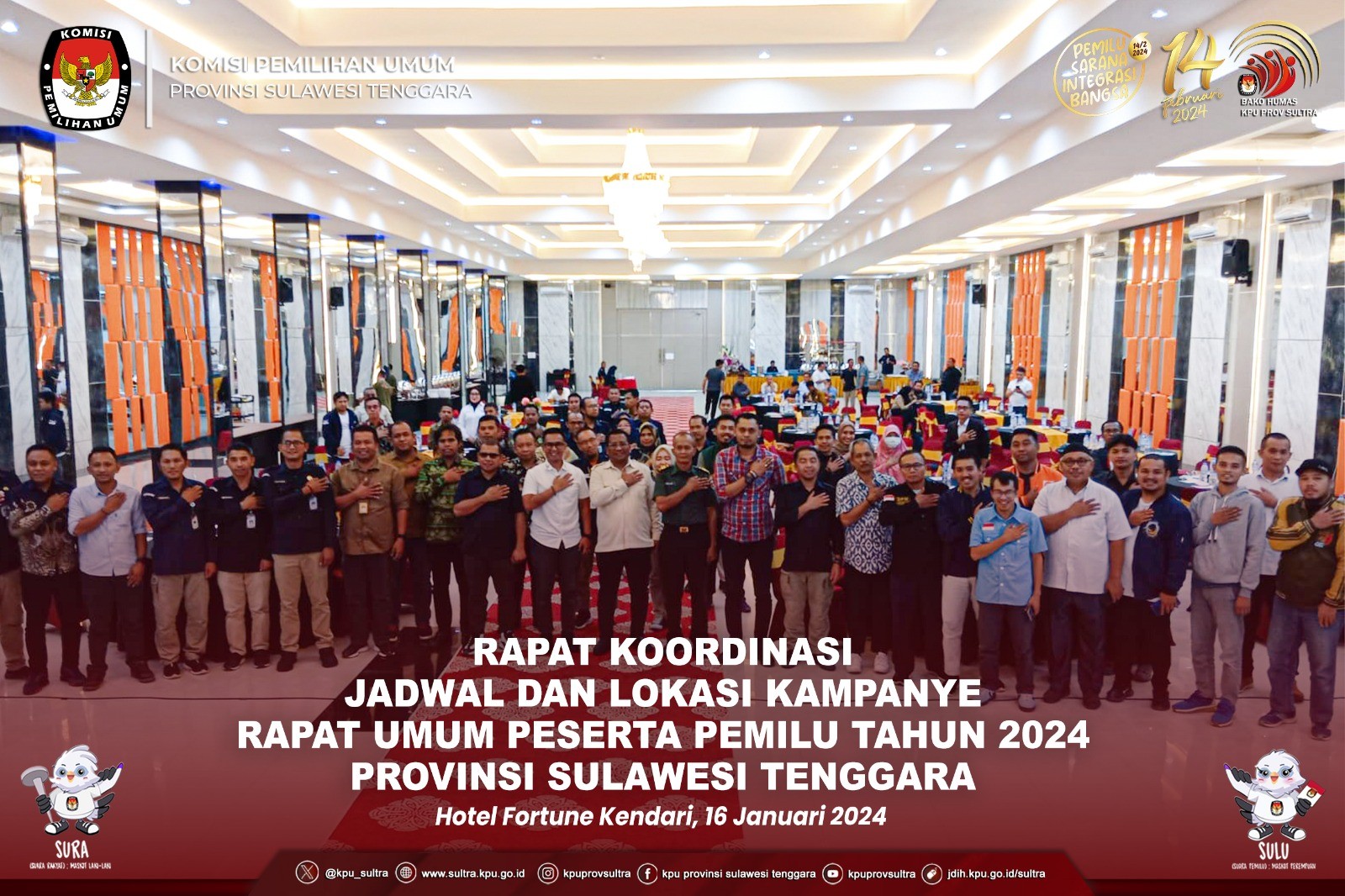 Kendari, 16 Januari KPU Provinsi Sulawesi Tenggara melaksanakan Rapat Koordinasi Jadwal dan Lokasi Kampanye Rapat Umum Peserta Pemilu Tahun 2024 di Hotel Fortune Kendari, yang di hadiri oleh Ketua KPU Prov. Sultra di dampingi Anggota KPU Prov. Sultra, Kepolisian Daerah Sulawesi Tenggara, Danrem 143 H/O, Bawaslu Prov. Sultra, Biro Pemerintahan Prov. Sultra dan Satpol PP Prov. Sultra dimana Peserta rapat yaitu Partai Politik peserta Pemilu Tahun 2024 dan Calon DPD Dapil Provinsi Sulawesi Tenggara Peserta Pemilu tahun 2024. Kegiatan ini dibuka oleh Ketua KPU Prov. Sultra Bapak Dr. Asril, S.Sos., M.Si sekaligus dalam Sambutannya menyampaikan rapat koordinasi ini adalah kegiatan awal di tahun 2024 yang di selenggarakan oleh Divisi Sosialisasi dan Pendidikan Pemilih, Partisipasi dan Hubungan Masyarakat dan SDM KPU Provinsi Sulawesi Tenggara. Saya menghimbau agar Divisi ini selain mengurus tahapan kampanye juga memastikan kesiapan rekan-rekan Badan Adhock terkhusus KPPS yang akan bertugas di TPS pada tanggal 14 Februari 2024. Selain itu di tanggal 28 januari 2024 kita sudah harus mempersiapkan hal-hal terkait pelaksanaan kampanye alat peraga dan titik lokasi kampanye, proses pertemuan terbatas atau pertemuan tatap muka serta Izin Pertemuan terbatas yang dikeluarkan oleh Kepolisian Daerah Sulawesi Tenggara. Dan untuk Kampanye Rapat Umum, Media Sosial, Media Elektronik dan Media Dalam Jaringan dimulai tanggal 21 Januari sampai 10 Februari 2024. kami menghimbau agar seluruh Peserta Pemilu Tahun 2024 untuk mempedomani regulasi yang telah dikeluarkan oleh KPU RI sebagai rujukan pelaksanaan Kampanye. Dimana KPU RI nantinya akan mengeluarkan persamaan Jadwal Kampanye Rapat Umum antara Pasangan Calon Presiden dan Wakil Presiden bersama Partai-Partai Politik Pendukung Pasangan Calon. Hal ini bertujuan untuk memudahkan pengawasan terhadap setiap proses pelaksanaan Kampanye Rapat Umum. Kami sampaikan kepada seluruh LO yang hadir pada kegiatan hari ini untuk menyampaikan kepada masing-masing Calon agar dalam proses Kampanye Rapat Umum nantinya sesuai dengan jadwal dan lokasi yang telah ditentukan dan tidak mengambil jadwal dan lokasi kampanye dari Calon Lain. DirOps Polda Sultra dalam penyampaiannya menghimbau kepada Seluruh Calon Peserta Pemilu yang akan melaksanakan Kampanye Rapat Umum agar melaporkan jadwalnya kepada Kepolisian Daerah Sulawesi Tenggara 7 (tujuh) hari sebelum pelaksanaan kampanye tersebut sehingga Kepolisian Daerah Sulawesi Tenggara dapat meminimalisir hal-hal yang tidak diinginkan dan demi tertibnya pelaksanaan Kampanye Rapat Umum. Koordinator Divisi Teknis Penyelenggaraan Pemilu KPU Prov. Sultra Hazamuddin, S.Sos., M.H menyampaikan terkait Laporan Awal Dana Kampanye (LADK), yang proses submitnya dilaksanakan pada tanggal 7 Januari 2024 oleh Peserta Pemilu baik dari Partai Politik maupun Calon DPD, dimana tidak semua Partai Politik Kabupaten/Kota menyampaikan Laporan Awal Dana Kampanye. Terhadap kejadian tersebut, berdasarkan Pasal 118 dan 119 PKPU 18 maka bagi Peserta Pemilu yang tidak menyampaikan sesuai dengan limit waktu yang telah ditentukan maka konsekuensinya adalah diskualifikasi dari kepesertaan Pemilu Tahun 2024 dan kewenangan itu berada di masing-masing lembaga KPU sesuai tingkatannya. Olehnya itu, KPU Kabupaten/Kota sudah melakukan klarifikasi terhadap Peserta Pemilu yang terlambat ataupun yang tidak menyampaikan LADK tersebut. Koordinator Divisi Perencanaan, Data dan Informasi, Muhammad Mu'min Fahimuddin, S.P., M.Si dalam penyampaiannya Dalam konteks menghadapi Tahapan Kampanye Rapat Umum yang dimulai tanggal 21 Januari 2024 nanti. Perlu diperhatikan hal-hal seperti apa dalam menggunakan fasilitas umum atau tidak, apakah orang-orang yang masuk dalam Kampanye Rapat Umum tersebut sudah masuk ke dalam tim kampanye atau tidak. Adapun Materi Kampanye Rapat Umum Peserta Pemilu Tahun 2024 yang disampaikan Oleh Koordinator Divisi Sosialisasi, Pendidikan Pemilih, Partisipasi dan Hubungan Masyarakat dan SDM, Amirudin, S.Pt anatara lain : Tempat pelaksanaan Rapat Umum meliputi : Lapangan, Stadion, Alun-alun, dan tempat terbuka lainnya dan pelaksanaannya harus memperhatikan daya tampung tempat tersebut. Petugas Kampanye Rapat Umum harus menyampaikan pemberitahuan tertulis kepada Kepolisian Republik Indonesia sesuai tingkatannya. Batas maksimum pemasangan iklan Kampanye Pemilu di Lembaga Penyiaran secara kumulatif. Memperhatikan Batas maksimum pemasangan iklan kampanye Pemilu di media massa cetak, media daring, dan media sosial. Adapun pengaturan dan penjadwalan Pemasangan Iklan Kampanye Pemilu diatur sepenuhnya oleh Media Massa Cetak dan Media Daring, Media Sosial, dan Lembaga Penyiaran