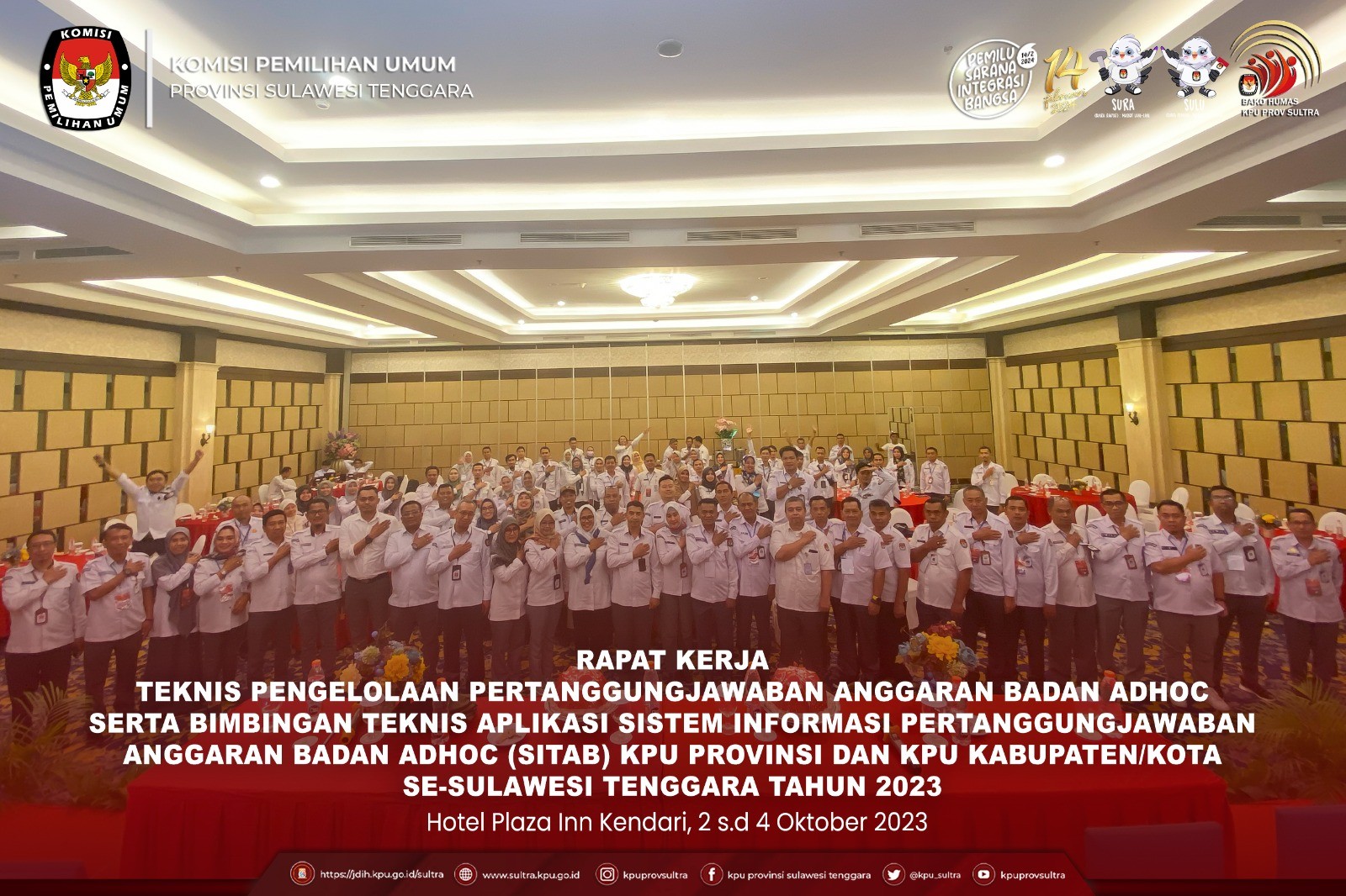 Rapat Kerja Teknis Pengelolaan Pertanggungjawaban Anggaran Badan Adhoc & Bimbingan Teknis Aplikasi Sistem informasi Pertangggungjawaban Anggaran Badan Adhoc (SITAB) bersama KPU Kabupaten/Kota Se Sulawesi Tenggara yang bertempat di Plaza Inn Hotel Kendari pada Senin 2 Oktober 2023.