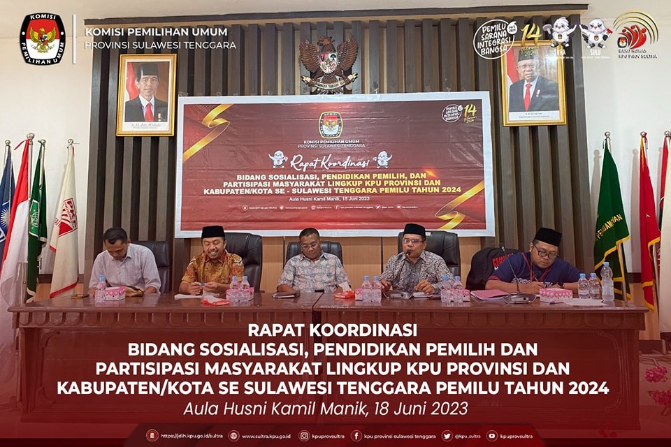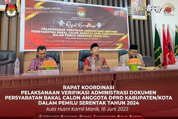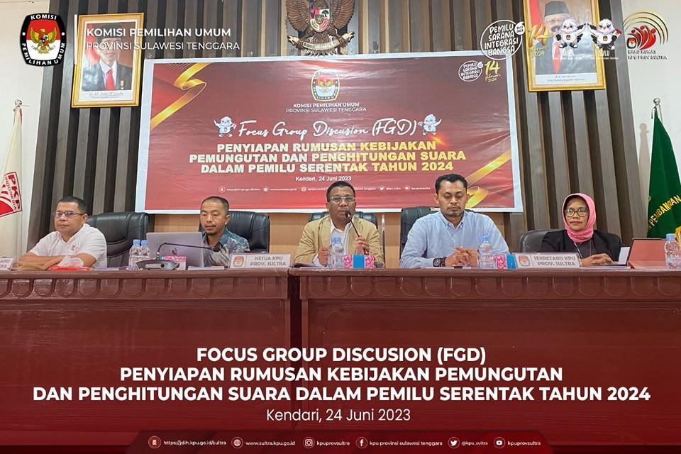 Bertempat di Aula Husni Kamil Manik KPU Provinsi Sulawesi Tenggara menggelar Focus Group Discussion (FGD) Penyiapan Rumusan Kebijakan Pemungutan dan Penghitungan Suara Dalam Pemilu Serentak Tahun 2024, Sabtu (24/06/2023) Kegiatan ini dihadiri oleh Partai Politik Peserta Pemilu Tahun 2024, HMI Badko Sultra, Kohati HMI Badko Sulawesi Tenggara, PMKRI Sultra, PMII Sultra, Korps Putri PMII Prov Sultra, JADI sultra, JPPR Sultra, dan Bakal Calon Anggota DPD. Membuka Kegiatan Ketua KPU Provinsi Sulawesi Tenggara, Asril mengatakan bahwa kegiatan Forum Group Discusion ini merupakan kegiatan yg dilaksanakan oleh KPU Provinsi Sulawesi Tenggara untuk meminta masukan dan saran kepada peserta kegiatan yang selama ini memiliki perhatian terhadap pelaksanaan Pemilu sebagai bahan perbaikan terhadap pelaksanaan demokrasi khususnya di Sulawesi Tenggara. "Mengingat selama ini pelaksanaan demokrasi khususnya di Sulawesi Tenggara masih terdapat beberapa hal yang harus mendapatkan perhatian serius untuk dijadikan bahan Evaluasi demi tercapainya cita cita luhur demokrasi" tegasnya.