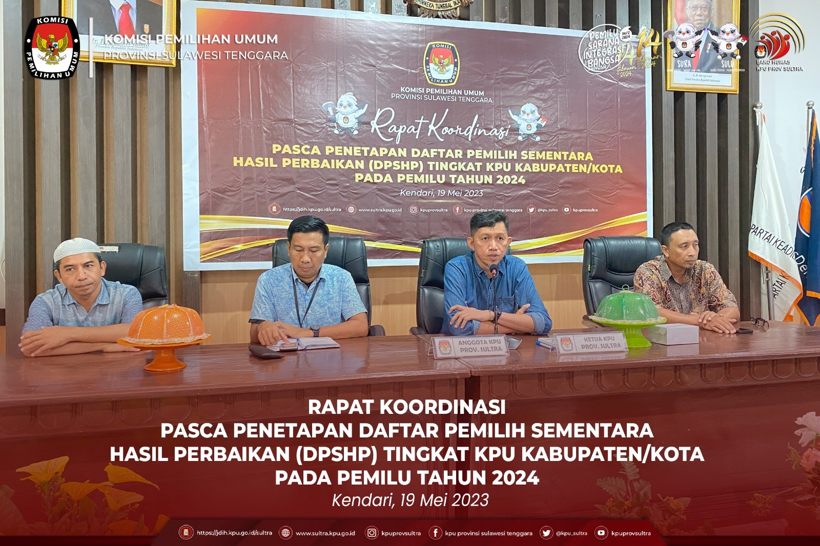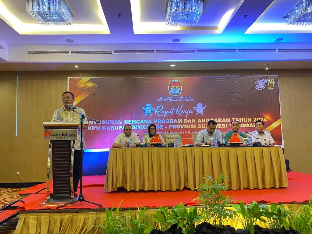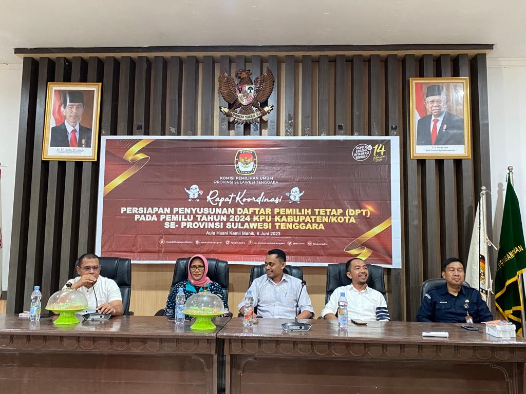 KPU Provinsi Sulawesi Tenggara menggelar Rapat Koordinasi persiapan penyusunan Daftar Pemilih Tetap (DPT) pada Pemilu Tahun 2024 bersama KPU Kabupaten/ Kota Se Sulawesi Tenggara bertempat di Aula Husni Kamil Manik, selasa (06/06/2023). Acara yang dihadiri oleh Koordinator Divisi Perencanaan Data dan Informasi, Kasubag Perencanaan Data dan Informasi serta Operator SIDALIH dibuka oleh Plh. Ketua KPU Provinsi Sulawesi Tenggara dalam sambutannya mengatakan bahwa dalam menyusun Daftar Pemilih Tetap (DPT) harus memperhatikan data data seperti invalid umur, pengecekan data ganda dan TNI/ Polri yang telah pensiun, kemudian untuk teman teman di tingkat PPK dan PPS diharapkan untuk terus menganalisis data sehingga data yang disajikan valid dan update. selanjutnya Koordinator Divisi Perencanaan Data dan Informasi KPU provinsi Sulawesi Tenggara Muh. Mu'min Fahimudiin mengemukakan bahwa kegiatan ini bertujuan untuk mengevaluasi secara menyekuruh hal hal yang perlu ditindaklanjuti demi keakuratan data yang akan disajikan pada pelaksanaan rapat pleno nanti. "untuk Data Ganda sebaiknya teman teman mengkonfirmasi secara langsung di lapangan terkait Invalid NKK, Invalid NIK dan tanggal lahir Invalid." tegas mu'mim