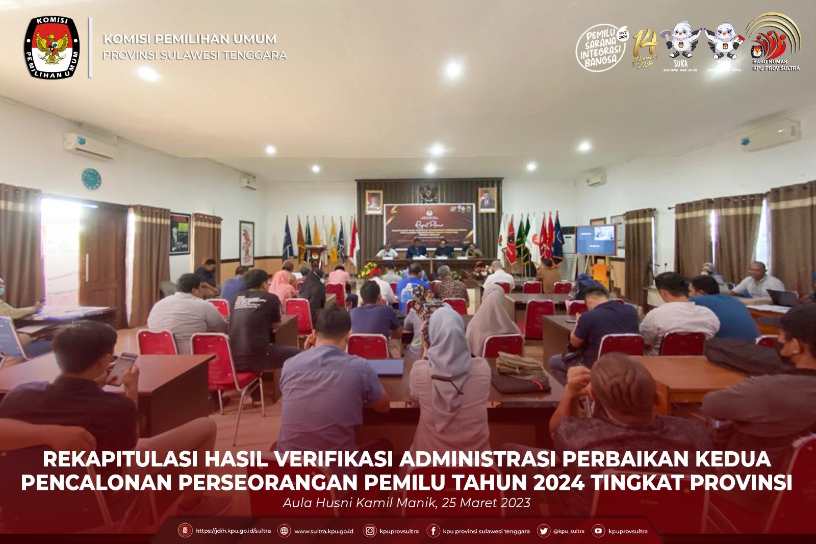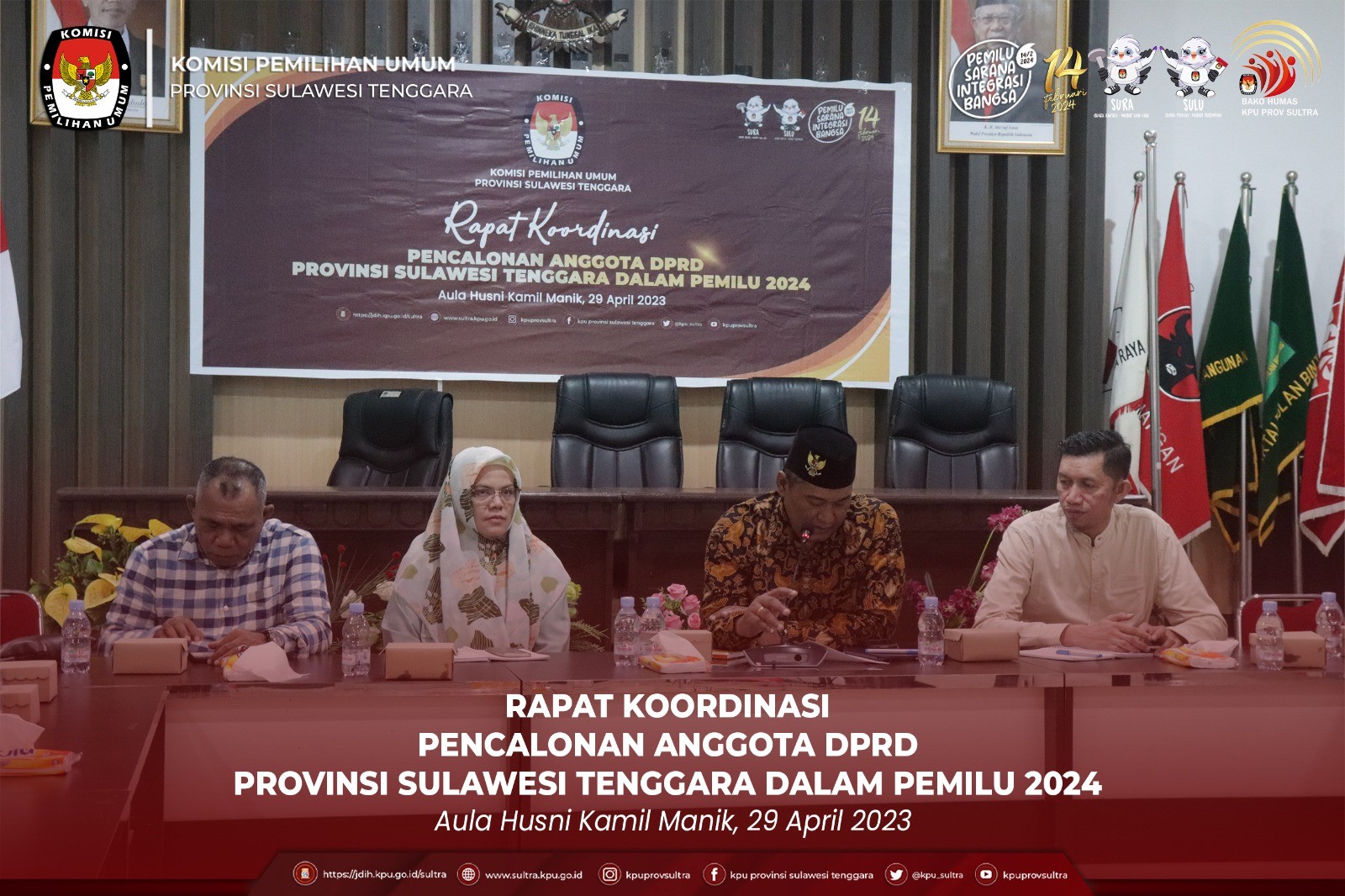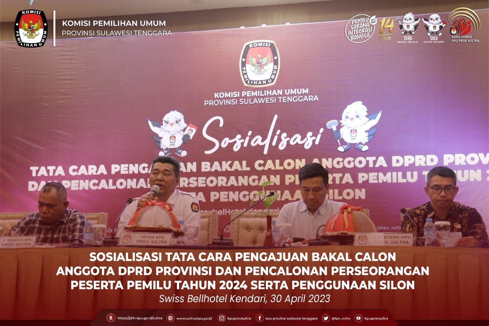 KPU Provinsi Sulawesi Tenggara menggelar kegiatan Sosialisasi Tata Cara Pengajuan Bakal Calon Anggota DPRD Provinsi dan Pencalonan Perseorangan Peserta Pemilu Tahun 2024 Serta Penggunaan SILON, bertempat di SwissBell Hotel Kendari, Minggu 30/04/2023. Kegiatan dihadiri oleh Ketua dan Sekretariat KPU Provinsi Sulawesi Tenggara, Pimpinan Partai Politik/L.O/Admin Partai Politik peserta Pemilu Tahun 2024 dan Calon Perseorangan DPD/L.O/Admin Calon Perseorangan DPD Peserta Pemilu Tahun 2024. Dalam Sambutannya Ketua KPU Provinsi Sulawesi Tenggara La Ode Abdul Natsir mengatakan baik Bakal Calon dari Partai Politik maupun Calon Perseorangan DPD untuk menjadi Calon dalam Pemilihan Umum Tahun 2024 harus melewati proses tahapan mulai dari pendaftaran hingga verifikasi dokumen persyaratan sebelum nama-nama Bakal Calon tersebut dimuat kedalam Daftar Calon Tetap (DCT). Selanjutnya KPU Provinsi Sulawesi Tenggara telah membuat Helpdesk Pencalonan Anggota DPD dan DPRD Provinsi Sulawesi Tenggara untuk Pemilu Serentak Tahun 2024 dengan tujuan membantu Partai Politik didalam proses pengajuan Bakal Calon maupun Calon Perseorangan DPD agar nantinya segala dokumen-dokumen persyaratan dapat terpenuhi dengan baik.