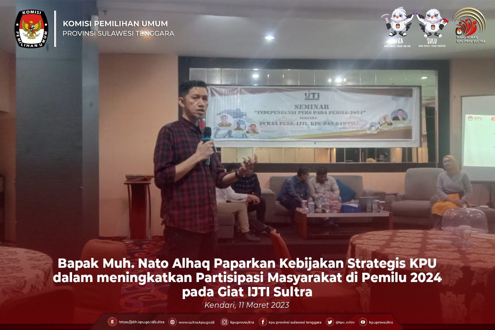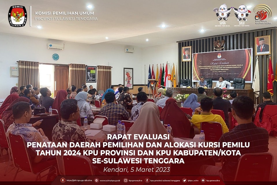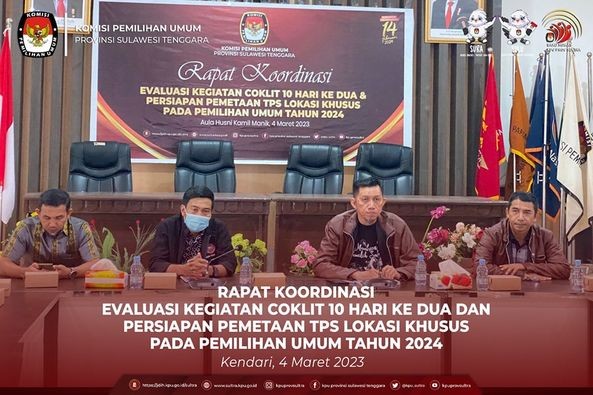 KPU Provinsi Sulawesi Tenggara menggelar Rapat Koordinasi Evaluasi Kegiatan Coklit 10 Hari Kedua dan Persiapan Pemetaan TPS Lokasi Khusus pada Pemilihan Umum Tahun 2024, Sabtu (4/03/2023) bertempat di Aula Husni Kamil Manik, Kegiatan yang dihadiri oleh Plh. Koordinator Divisi Data dan Informasi serta Operator Sidalih KPU Kabupaten/Kota se Sulawesi Tenggara dibuka oleh Plh. Ketua KPU Provinsi Sulawesi Tenggara Bapak Muhammad Nato Alhaq mengatakan bahwa walaupun masih banyak hambatan utamanya dalam hal akses ke E Coklit pada hari ini kita saling berkoordinasi dalam menemukan formulasi terbaik dalam menyelesaikan masalah yang timbul selama 10 hari pertama pelaksanaan E coklit ini utamanaya pada 6 Kabupaten/ Kota dengan persentasi pencapaian terendah. " dengan memaksimalkan kerja kerja pada sistem manajerial, kontrol, monitoring diharapkan masalah teknis kewilayahan dan kependudukan ataupun hambatan geografis dapat kita hadapi sehingga target akan tercapai sesuai dengan jadwal dan data yang diperoleh lebih akuntabel" tambah Nato