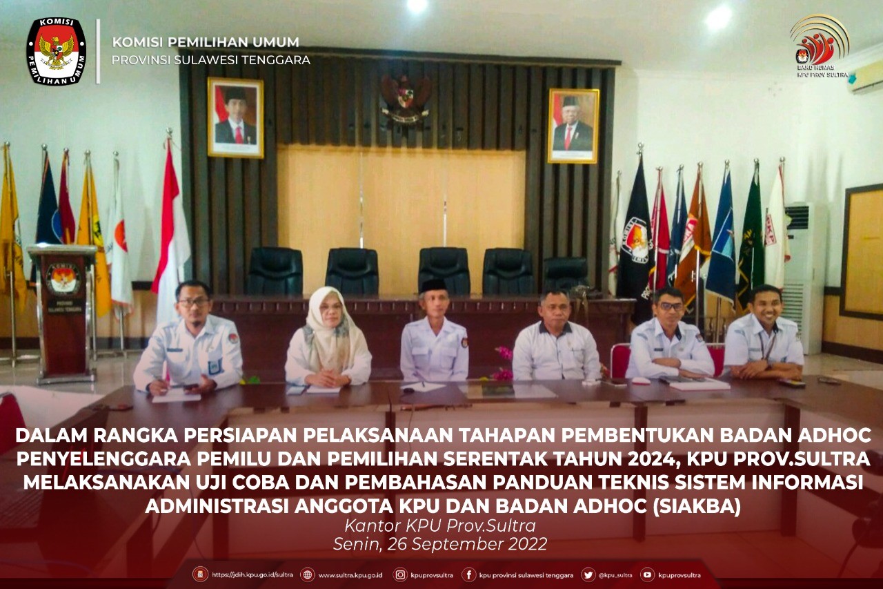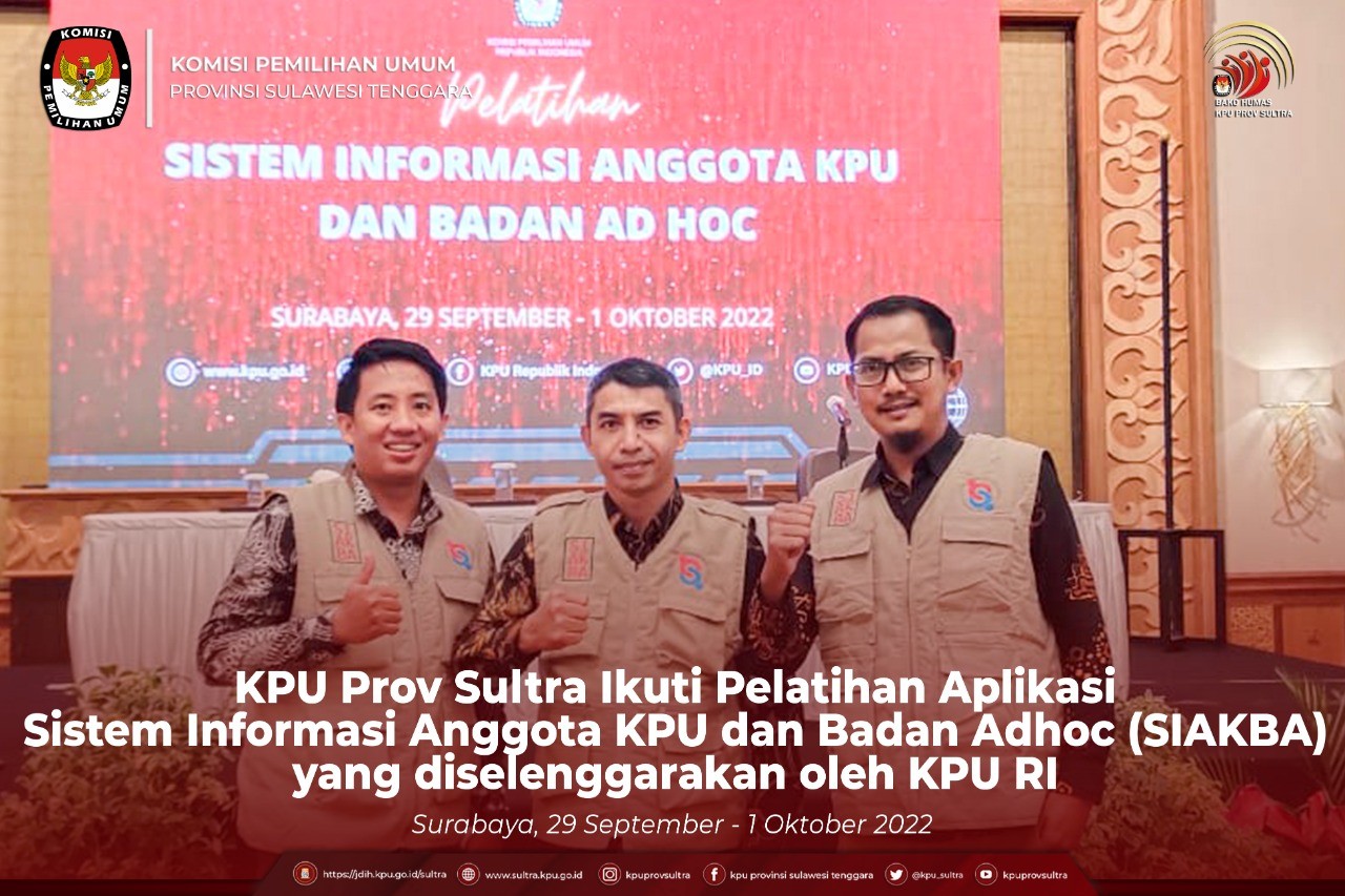 KPU Provinsi Sulawesi Tenggara mengikuti Pelatihan Sistem Informasi Anggota KPU dan Badan AD Hoc yang berlangsung di Hotel Shangrilla Surabayadari tanggal 29 september-1 Oktober 2022 yang dihadiri oleh Kepala Bagian yang membidangi Hukum dan Sumber Daya Mnausia Baharuddin, dan Kepala Subbagian yang membidangi Sumber Daya Manusia Taufik Ahmad di dampingi oleh Operator SIAKBA Fadel Muhammad. Acara yang dibuka oleh Ketua KPU Hasyim Asy'ari menyampaikan bahwa Melalui kegiatan ini diharapkan tujuan SIAKBA sebagai sistem informasi yang memudahkan dan mengefektifkan kerja pemilu dan pemilihan dapat tercapai, dengan ukuran semakin dipahami dan dikuasai semua jajaran KPU. "Selain itu diharapkan masukan dari Kabag, Kasubbag dan Operator SIAKBA se-Indonesia untuk lebih memperkuat sistem informasi ini. beberapa hal teknis yang belum dipahami dan modul yang kurang memadai untuk segera disampaikan" Tambah Hasyim. Pada kesempatan yang sama Kepala Pusat Pelatihan, Penelitian dan Pengembangan KPU, Wahyu Yudi Wijayanti mengungkapkan Aplikasi ini dibuat untuk mendukung rekrutmen anggota KPU dan badan ad hoc serta Pengganti Antarwaktu (PAW). Sementara pelatihan SIAKBA ditujukan untuk memberikan pengetahuan dan pemahaman pengoperasian SIAKBA kepada SDM KPU. Pada kegiatan ini dijadwalkan 3 sesi yaitu pelatihan modul operasional, pelatihan SIAKBA dan pendaftaran dan trouble shooting, serta teknis hubungan personalia dan anggaran. .