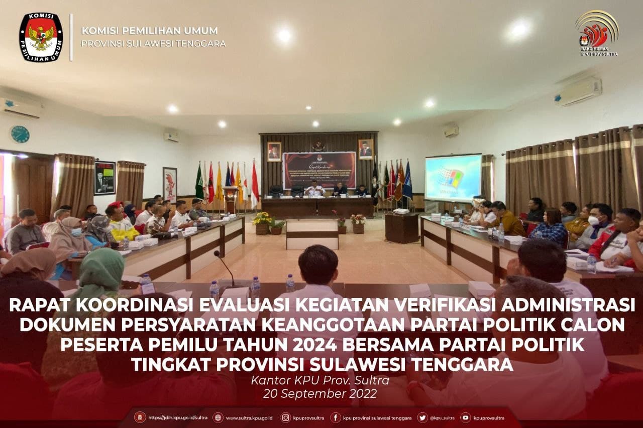 Kendari, Dalam rangka mengevaluasi hasil Verifikasi Adminitrasi Partai Politik sebelumnya dan mempersiapkan pelaksanaan verifikasi administrasi perbaikan dokumen keanggotaan Partai Politik Calon Peserta Pemilu2024, KPU Provinsi Sulawesi Tenggara mengadakan Rapat Koordinasi Evaluasi Kegiatan Verifikasi Adminitrasi Dokumen Persyaratan Keanggotaan Partai Politik Calon Peserta Pemilu Tahun 2024 Bersama Partai Politik Tingkat Provinsi Sulawesi Tenggara bertempat di Aula Husni Kamil Malik, selasa (20/09/2022). Dengan mengundang Admin/ LO Partai Politik Calon Peserta Pemilu Tahun 20224, kegiatan yang dikemas dalam bentuk FGD (Forum Group Discussion) ini lebih banyak memberikan kesempatan kepada para Pengurus Partai untuk menyampaikan pengalaman dan permasalahan yang dihadapi pada saat pelaksanaan Verifikasi administrasi. Membuka kegiatan, dalam sambutannya Ketua KPU Provinsi Sulawesi Tenggara, Dr.La Ode Abdul Natsir, S.E.,M.Si menyampaikan,“Pada Tahapan Verifikasi Administrasi yang lalu masih ada beberapa partai politik yang belum memenuhi persyaratan atau belum melakukan perbaikan khususnya untuk keanggotaan Parpol, apabila sampai tanggal 13 Desember 2022 Parpol tersebut tidak melakukan perbaikan maka KPU RI akan memutuskan bukan sebagai peserta Pemilu”. Selanjutnya diharapkan agar selalu terjalin koordinasi antar LO Partai dengan KPU terkait verifikasi administrasi sebelum maju ketahapan verifikasi faktual keanggotaan Partai. “Kepada Parpol yang masih dalam perbaikan agar memanfaatkan kesempatan ini semaksimal mungkin untuk melakukan perbaikan dan tetap intens dalam berkoordinasi sehingga memudahkan dalam pelaksanaan Tahapan Verifikasi faktual di lapangan” tambah Natsir. Dalam kesempatan yang sama, Koordinator Divisi Teknis Penyelenggaraan Pemilu KPU Provinsi Sulawesi Tenggara Iwan Rompo Banne, S.Sos.,M.Si mengatakan dengan adanya kegiatan ini kita dapat menghimpun dan menyusun Daftar Inventaris Masalah yang sumbernya berasal dari Partai Politik kemudian akan kita simpulkan menjadi laporan KPU Provinsi kepada KPU RI. Lebih jauh dijelaskan bahwa dari hasil verifikasi administrasi, ada 9 Partai Politik yang telah memenuhi syarat serta terdapat beberapa Partai Poltik yang masih harus mengikuti tahapan perbaikan Verifikasi Administrasi. Untuk diketahui jumlah syarat minimal Data Partai Politik setiap Kab./Kota di Sulawesi Tenggara sebagai berikut: • Kolaka : 239 • Konawe : 261 • Muna : 225 • Buton : 120 • Konsel : 315 • Bombana : 152 • Wakatobi : 116 • Kolut : 136 • Konut : 72 • Butur : 70 • Koltim : 125 • Konkep : 40 • Mubar : 85 • Buteng : 120 • Busel : 100 • Kota Kendari : 344 • Bau-Bau : 159