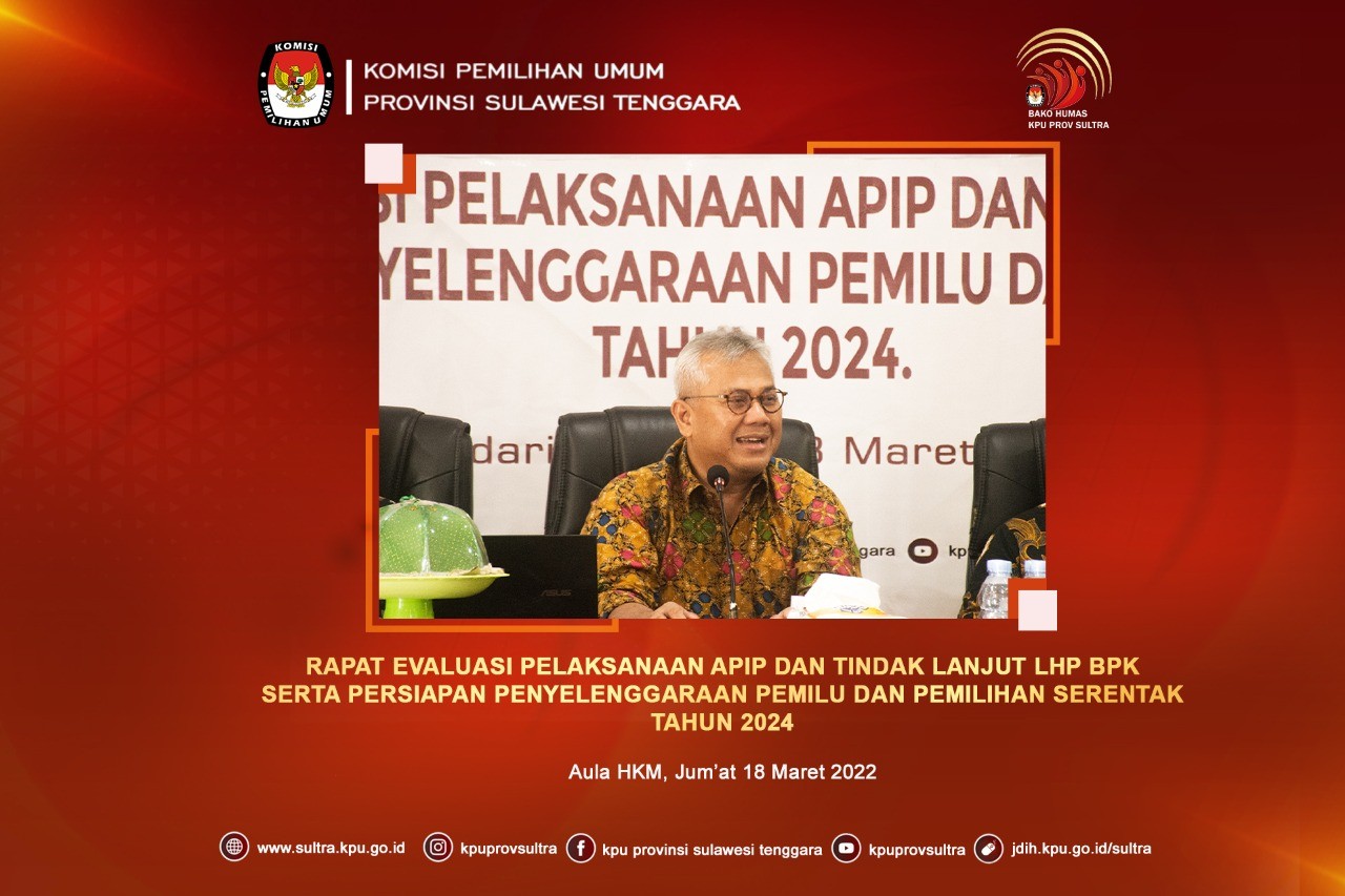 kendari, 18-03-2024. Bertempat di Aula Husni Kamil Manik KPU Provinsi Sulawesi Tenggara menerima kunjungan Anggota KPU RI Divisi SDM, Organisasi, Pendidikan dan Pelatihan dan Pelatihan dan Penelitian dan Pengembangan Wilayah Bapak Arief Budiman dan Deputi Teknis KPU RI Bapak Nanang Priyatna bersama Inspektur Utama dan Inspektur Wilayah I Inspektorat KPU RI dalam rangka kegiatan Rapat Evaluasi Pelaksanaan Aparat Pengawasan dan Intern Pemerintah (APIP) dan Tindak Lanjut Laporan Hasil Pemeriksaan Badan pemeriksa Keuangan (LHPBPK).