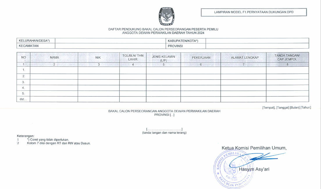 Sesuai dengan Ketentuan Pasal 182 huruf P dan Pasal 183 Undang-undang Nomor 7 Tahun 2017 tentang Pemilihan Umum bahwa calon perseorangan Peserta Pemilu anggota DPD dipersyaratkan mendapatkan dukungan minimal dari pemilih di daerah pemilihan yang bersangkutan