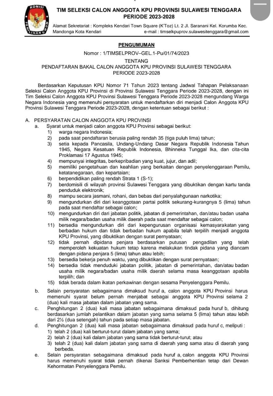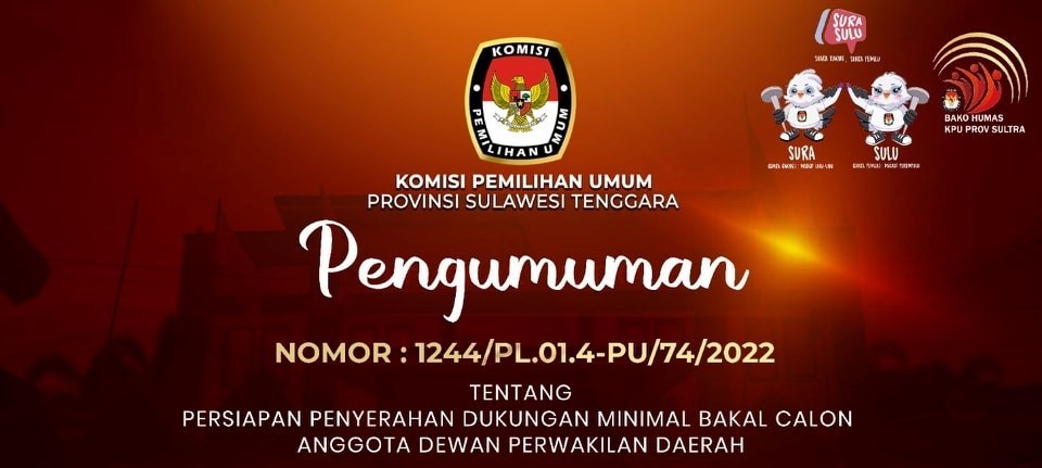 Kepada Bakal Calon Anggota Dewan Perwakilan Daerah (DPD) Pemilu Tahun 2024, Berikut Pengumuman KPU Provinsi Sulawesi Tenggara tentang Persiapan Penyerahan Dukungan Minimal Bakal Calon Anggota Dewan Perwakilan Daerah, untuk di ketahui..