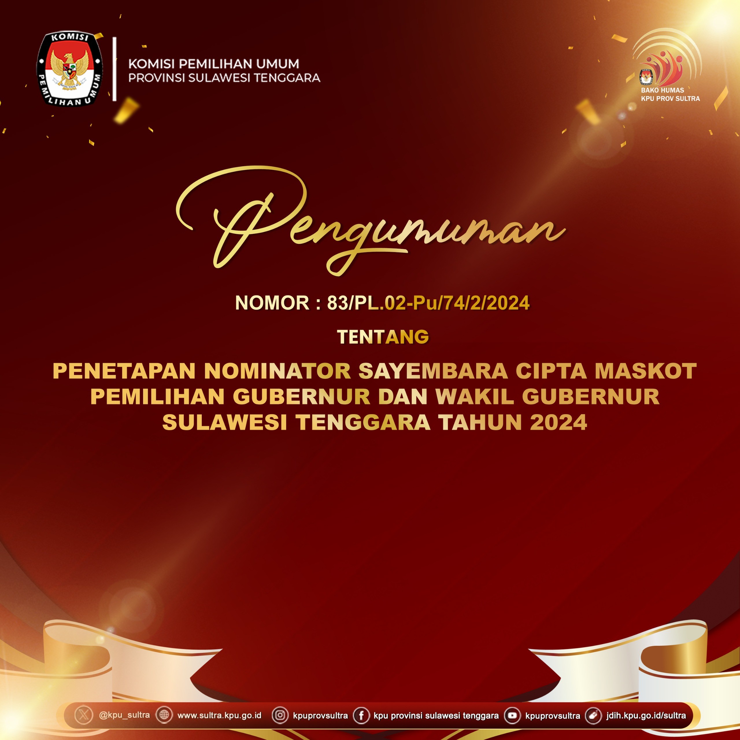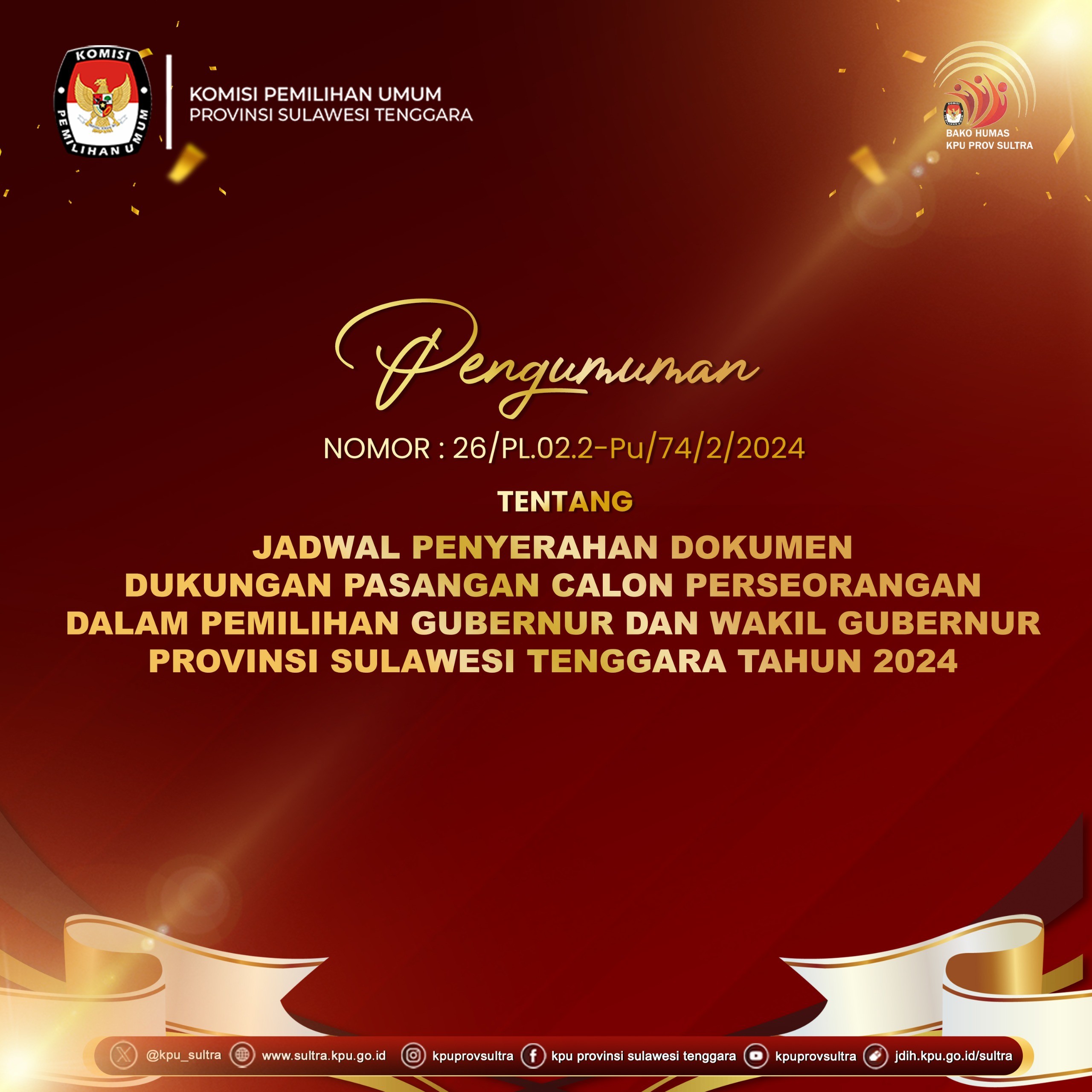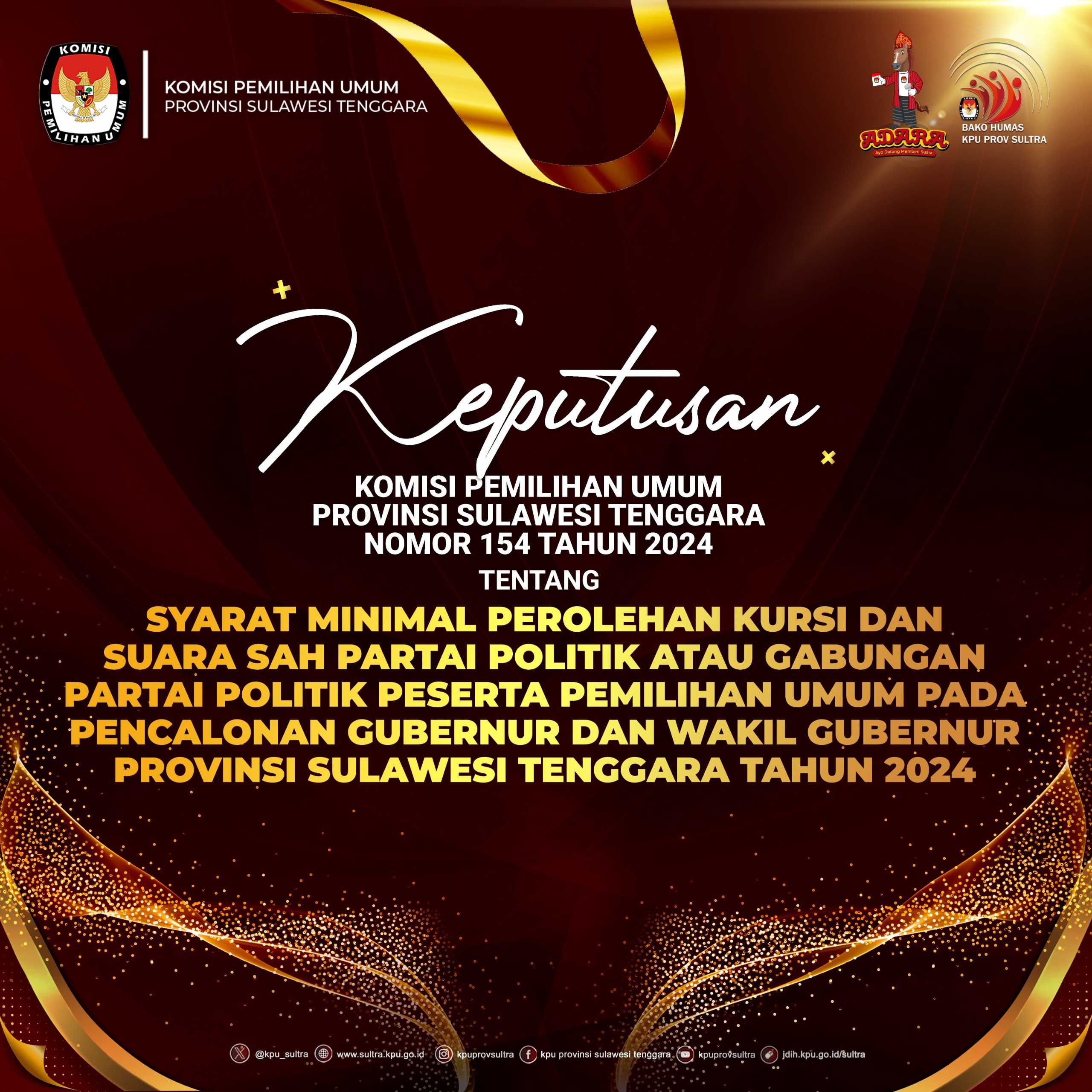 sehubungan dengan hal tersebut Komisi Pemilihan Umum Provinsi Sulawesi Tenggara menetapkan Keputusan Komisi Pemilihan Umum Provinsi Sulawesi Tenggara Nomor 145 Tahun 2024 tentang Syarat Minimal Perolehan Kursi dan Suara Sah Partai Politik atau Gabungan Partai Politik Peserta Pemilihan Umum pada Pencalonan Gubernur dan Wakil Gubernur Provinsi Sulawesi Tenggara Tahun 2024.