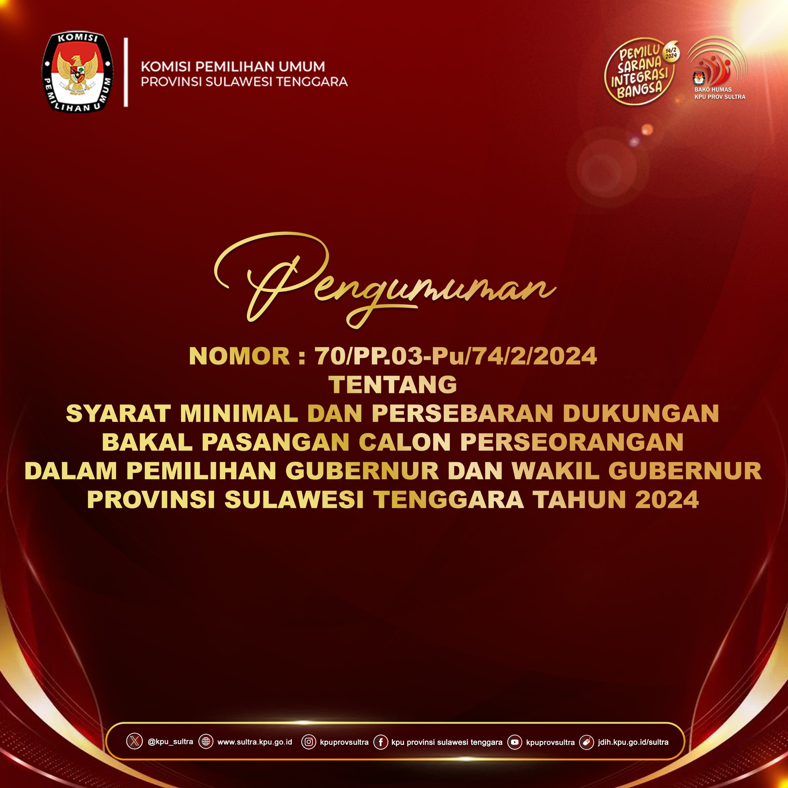 Berikut syarat dan persebaran dukungan bakal pasangan calon perseorangan pada Pemilihan Gubernur dan Wakil Gubernur Provinsi Sulawesi Tenggara tahun 2024