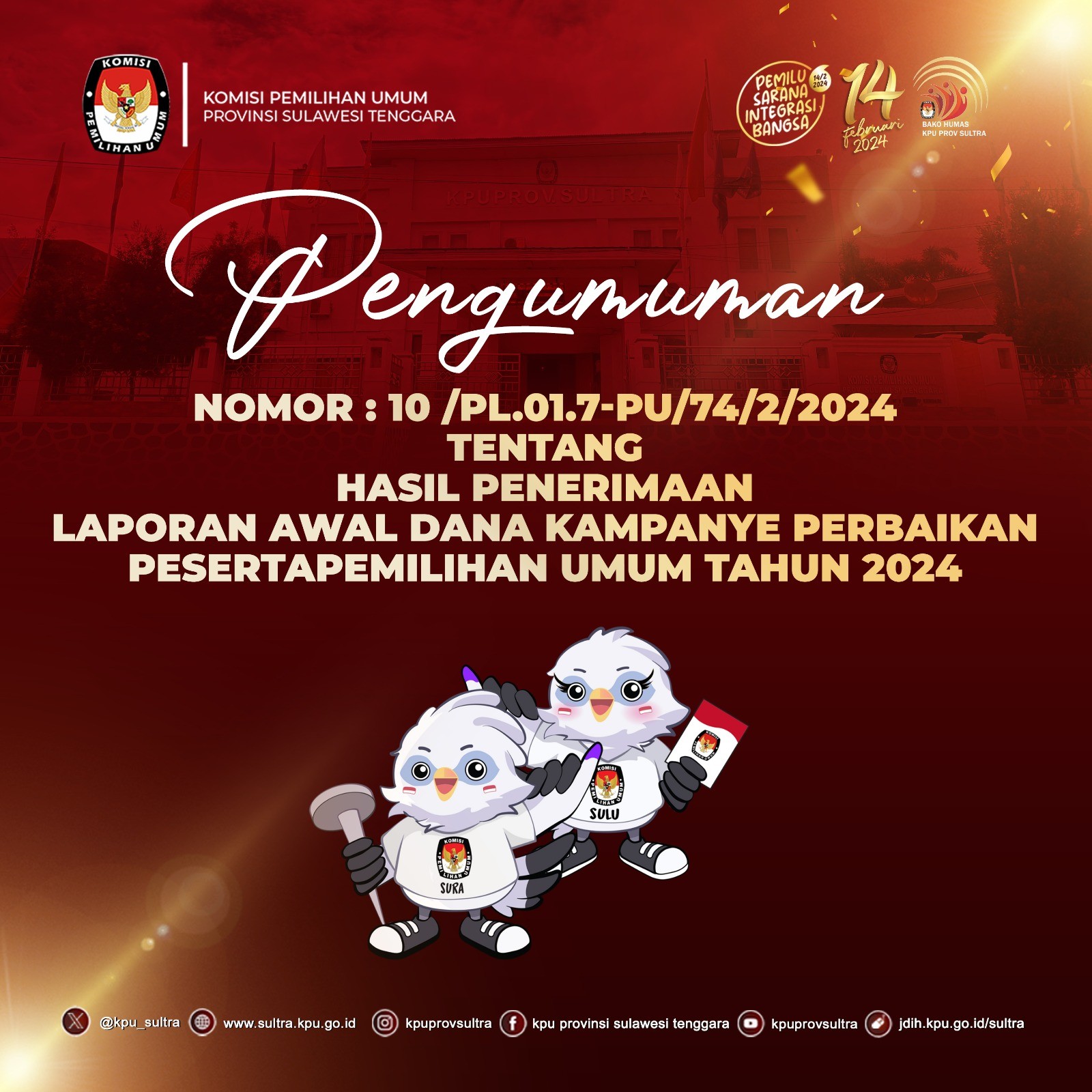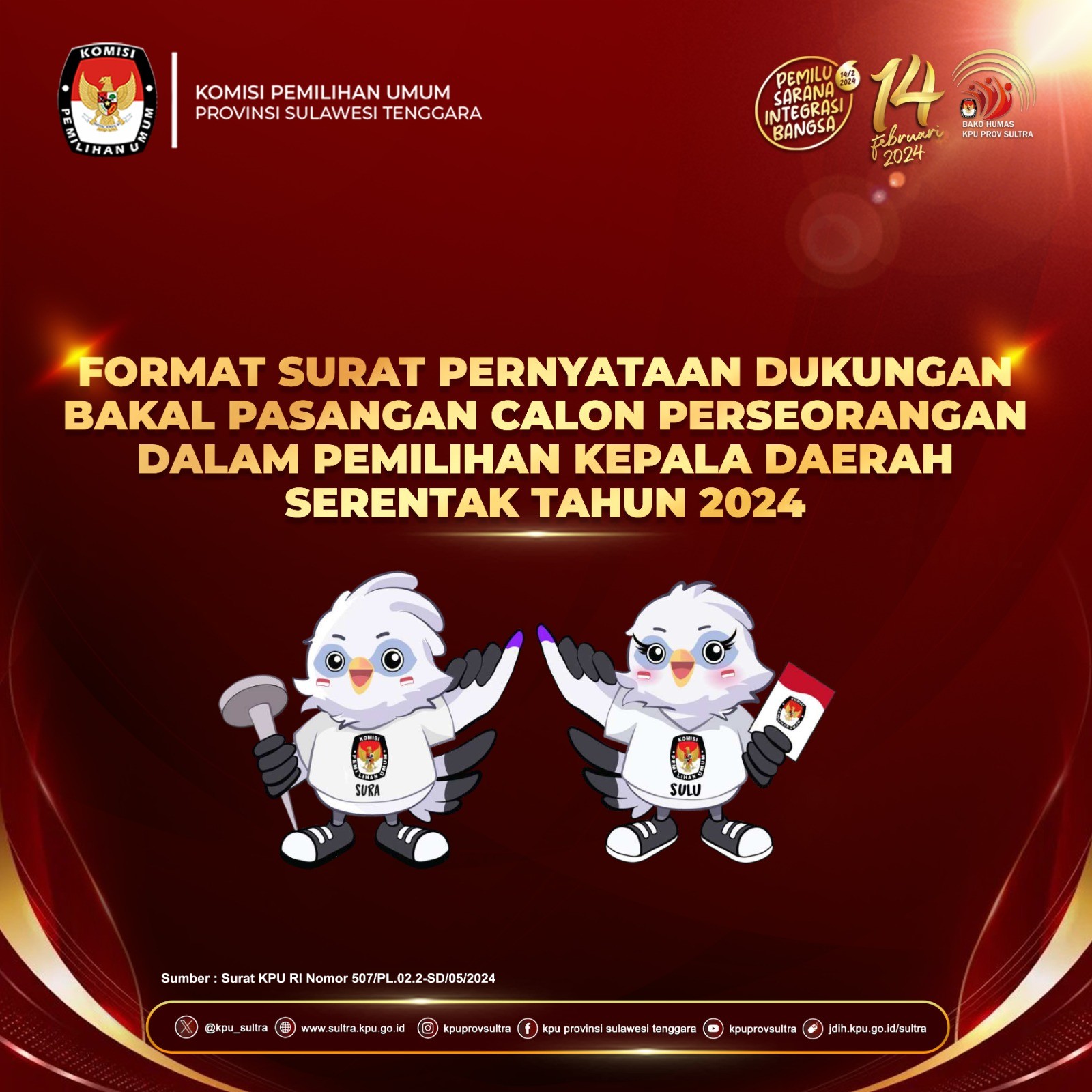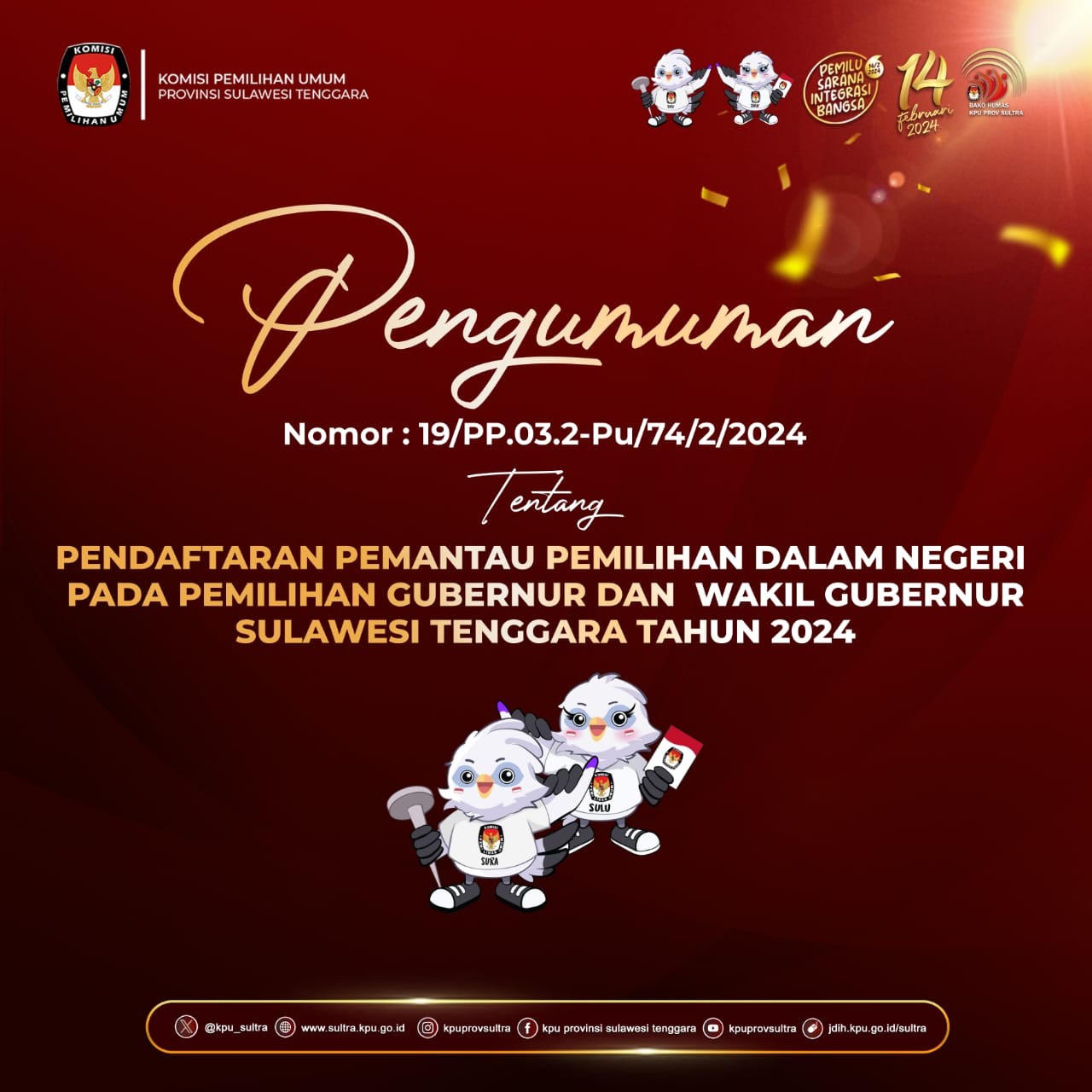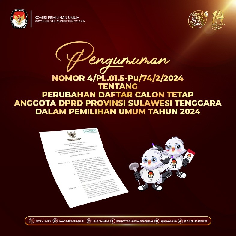 Dalam rangka melaksanakan Ketentuan Peraturan Komisi Pemilihan Umum Nomor 2 Tahun 2024 tentang Tahapan dan Jadwal Pemilihan Gubernur dan Wakil Gubernur, Bupati dan Wakil Bupati, serta Walikota dan Wakil Walikota Tahun 2024, Komisi Pemilihan Umum Provinsi Sulawesi Tenggara mengumumkan Pendaftaran Pemantau Pemilihan Dalam Negeri Pemilihan Gubernur dan Wakil Gubernur Provinsi Sulawesi Tenggara Tahun 2024, dengan ketentuan sebagai berikut :